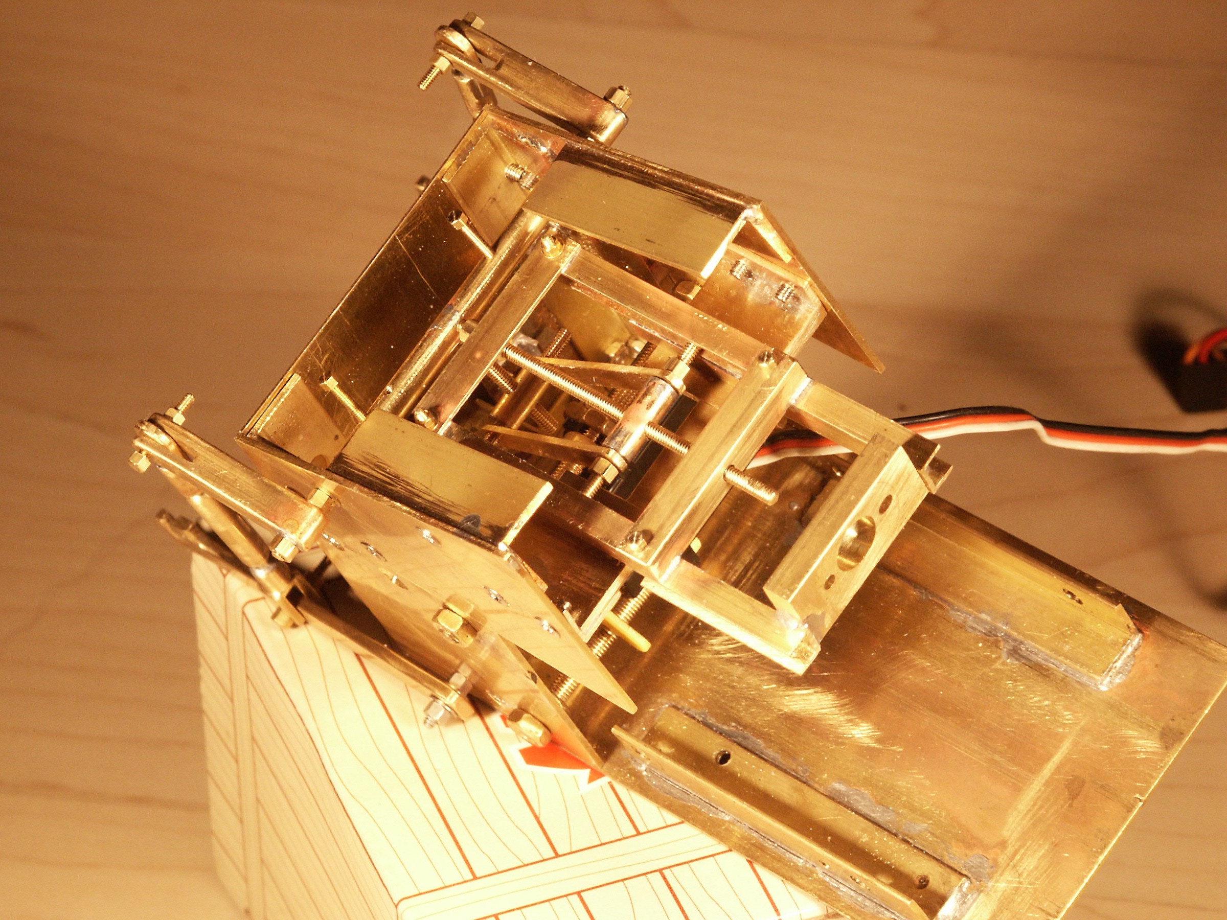 Die beiden innen liegenden Messingrohre des Krafthebers sind durch ein Messingflachprofil kraftschlüssig verbunden. Darauf ist ein Rechteckprofil, um die Längsachse beweglich, an zwei Winkeln befestigt. In diesem Profil ist mittig eine Bohrung mit