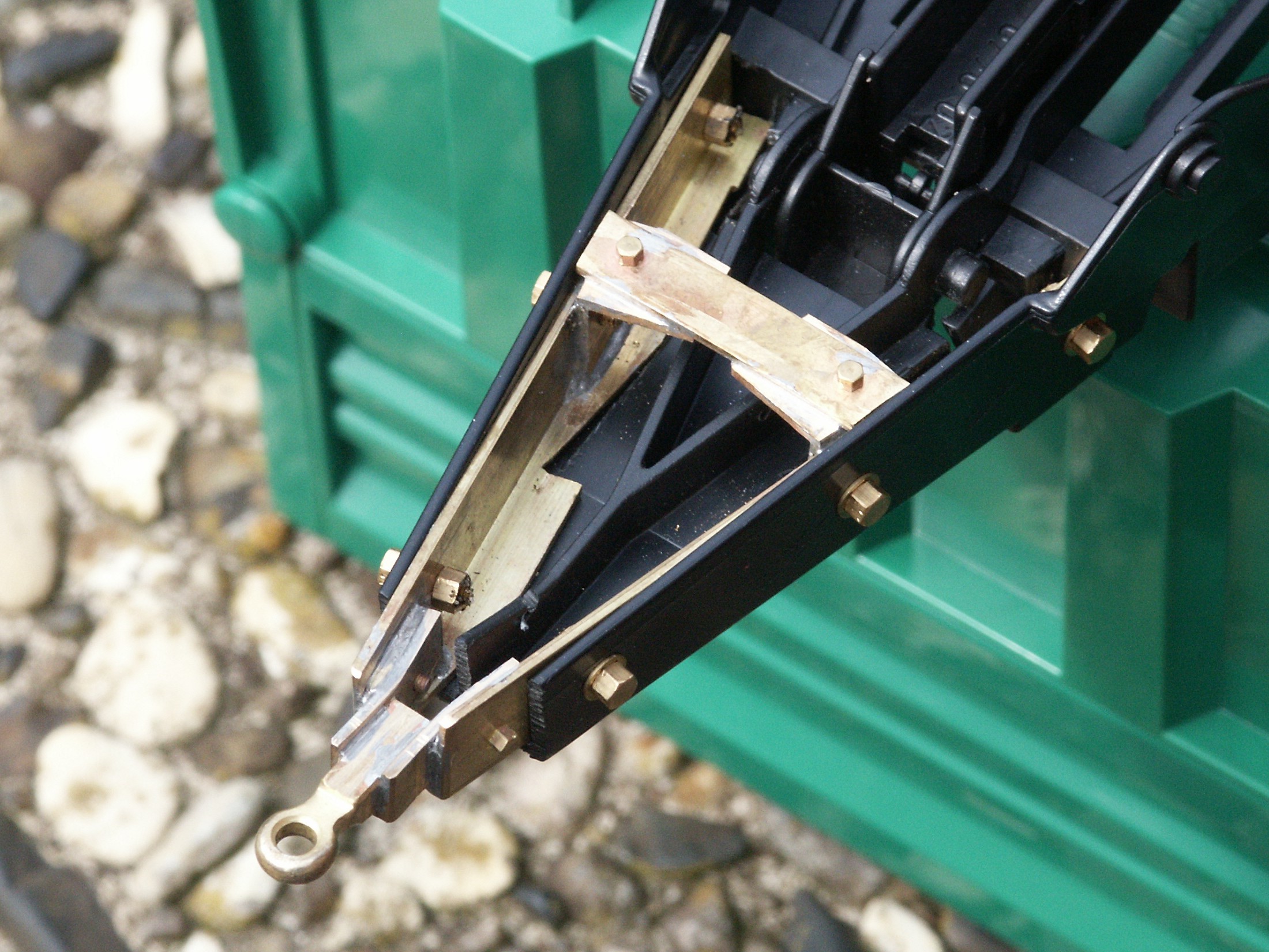 behalten, habe ich nur zwei Traversen eingebaut. Eine Traverse sitzt ganz hinten im Rahmen und trägt gleichzeitig die Stoßstange und das rahmenseitige Kipplager. Die zweite sitzt im vorderen Bereich, dort wo die Rahmenwangen nach unten abknicken. Die Zugvorrichtung brauchte ich nur aus dem alten Rahmen in den Neuen umzusetzen. Die Kippbrücke wollte ich von Bruder übernehmen aber der Boden sollte verstärkt werden. Die Messingplatte auf dem linken Bild wird unter den Kipperaufbau geschraubt. An der Platte sind die Kipplager des Aufbaus angelötet, auch die Anlenkung der Kippeinrichtung soll daran befestigt werden.
