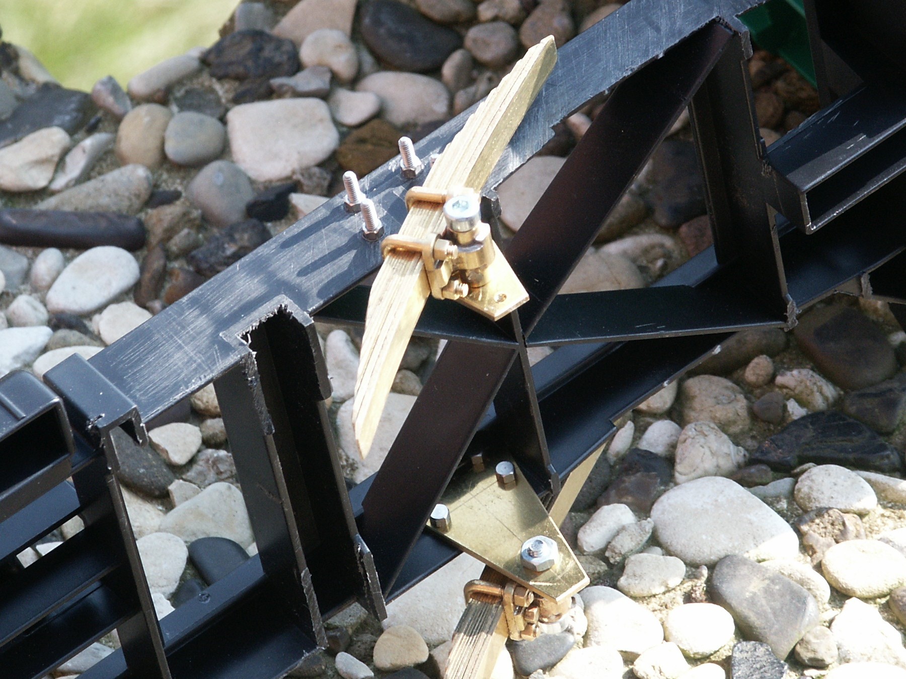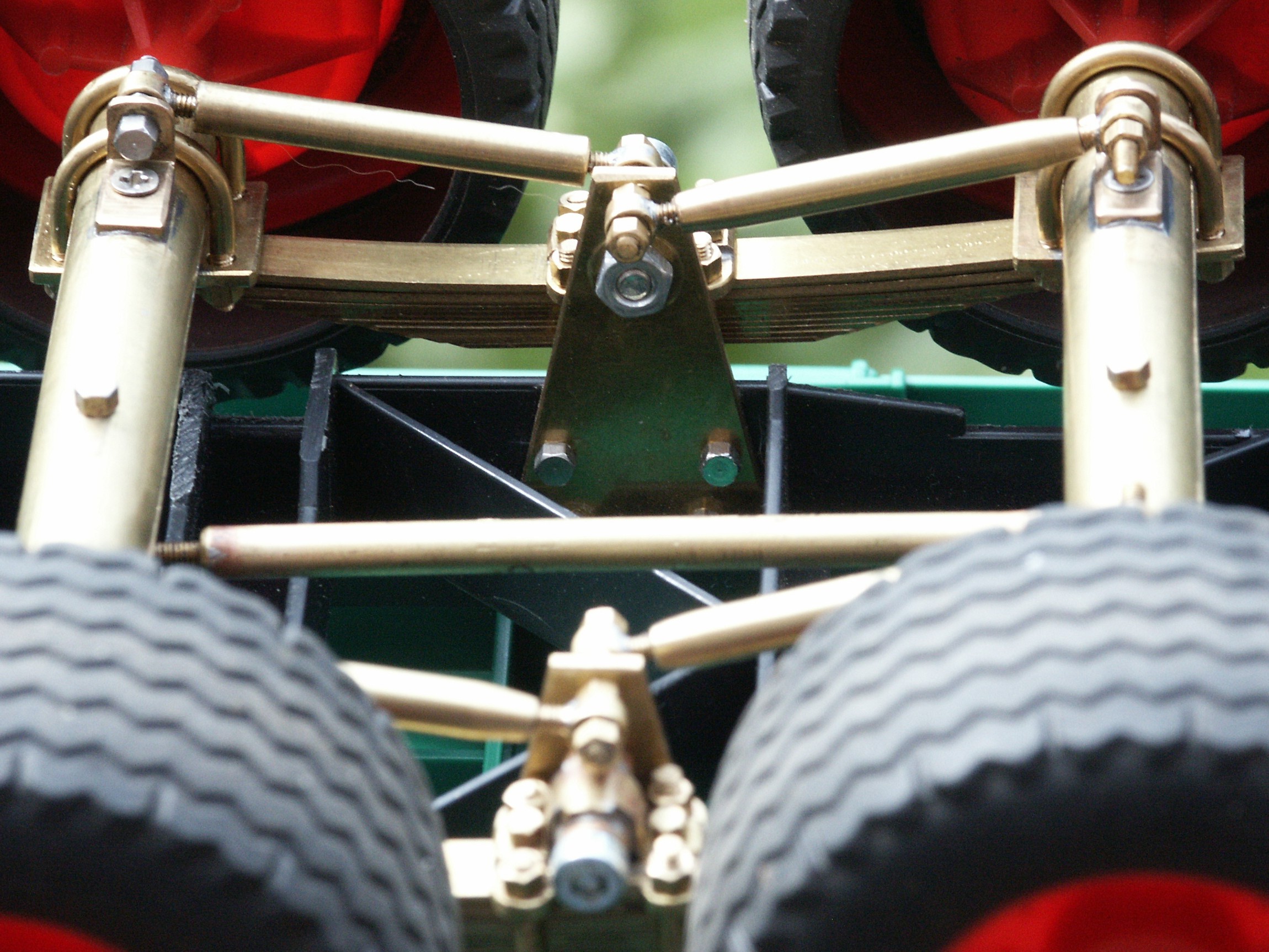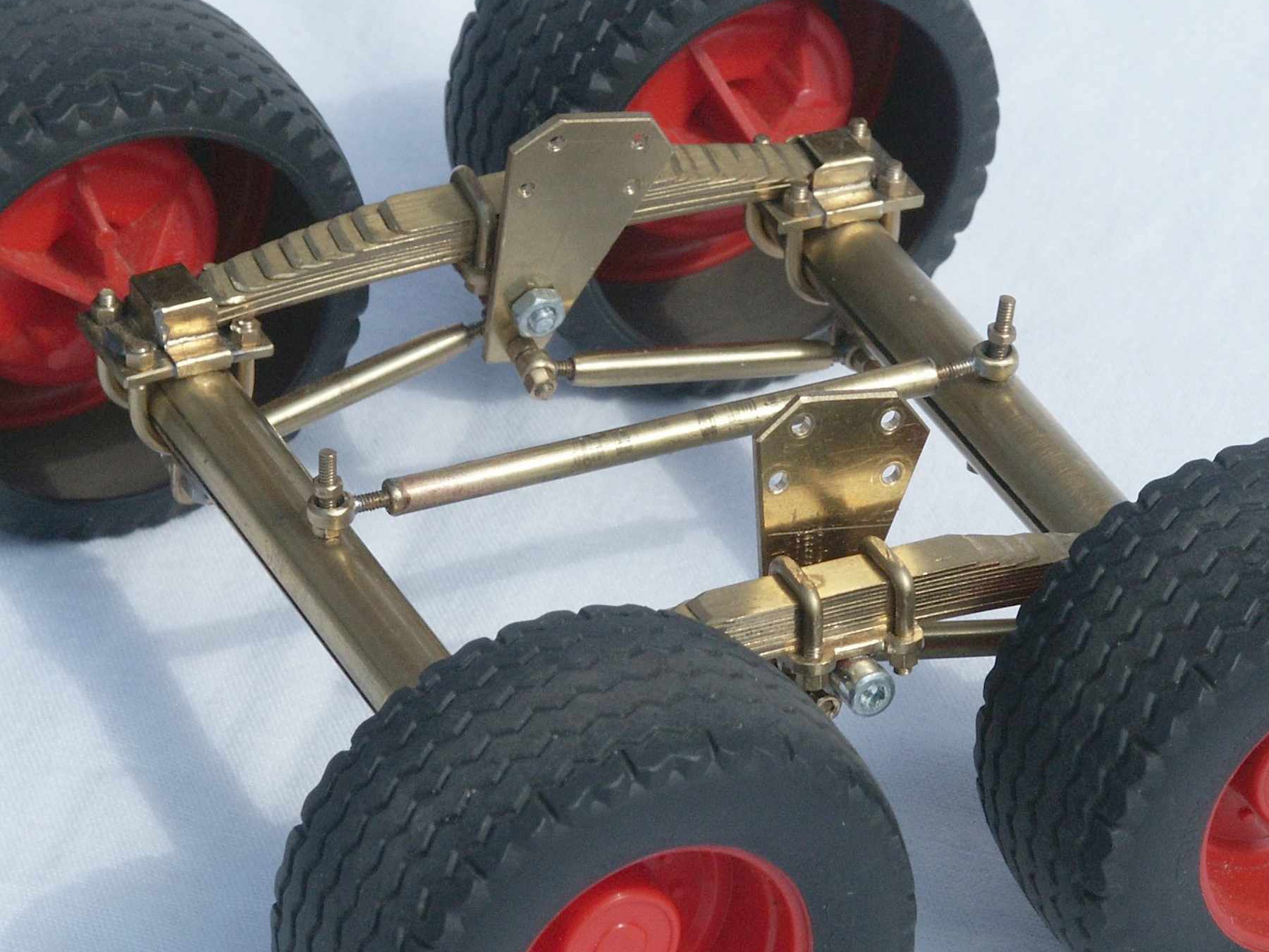 hatte ich eine kugelgelagerte Achse mit den Rädern von Bruder. Die Muttern mussten an den Kanten etwas abgefeilt werden, damit sie in das 10 mm Rohr passen.Die Federn sind aus 10 Lagen Messingblech in 6 mm Breite, davon sind zwei Lagen 1 mm und die restlichen 8 Lagen 0,5 mm stark. Eine Federwirkung ist nicht zu erkennen, entgegen meiner anfänglichen Befürchtung verbiegen sich die Streifen bei Belastung aber auch nicht. Bei der nächsten Achse werde ich es einmal mit Federbronze versuchen.
