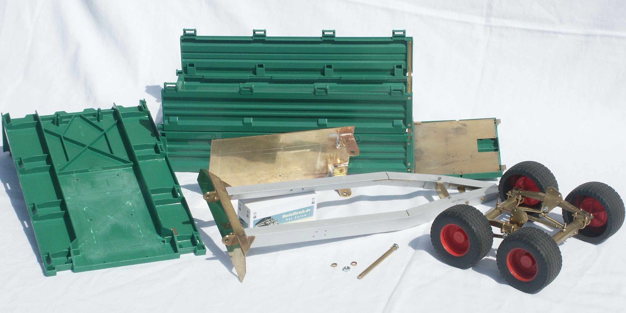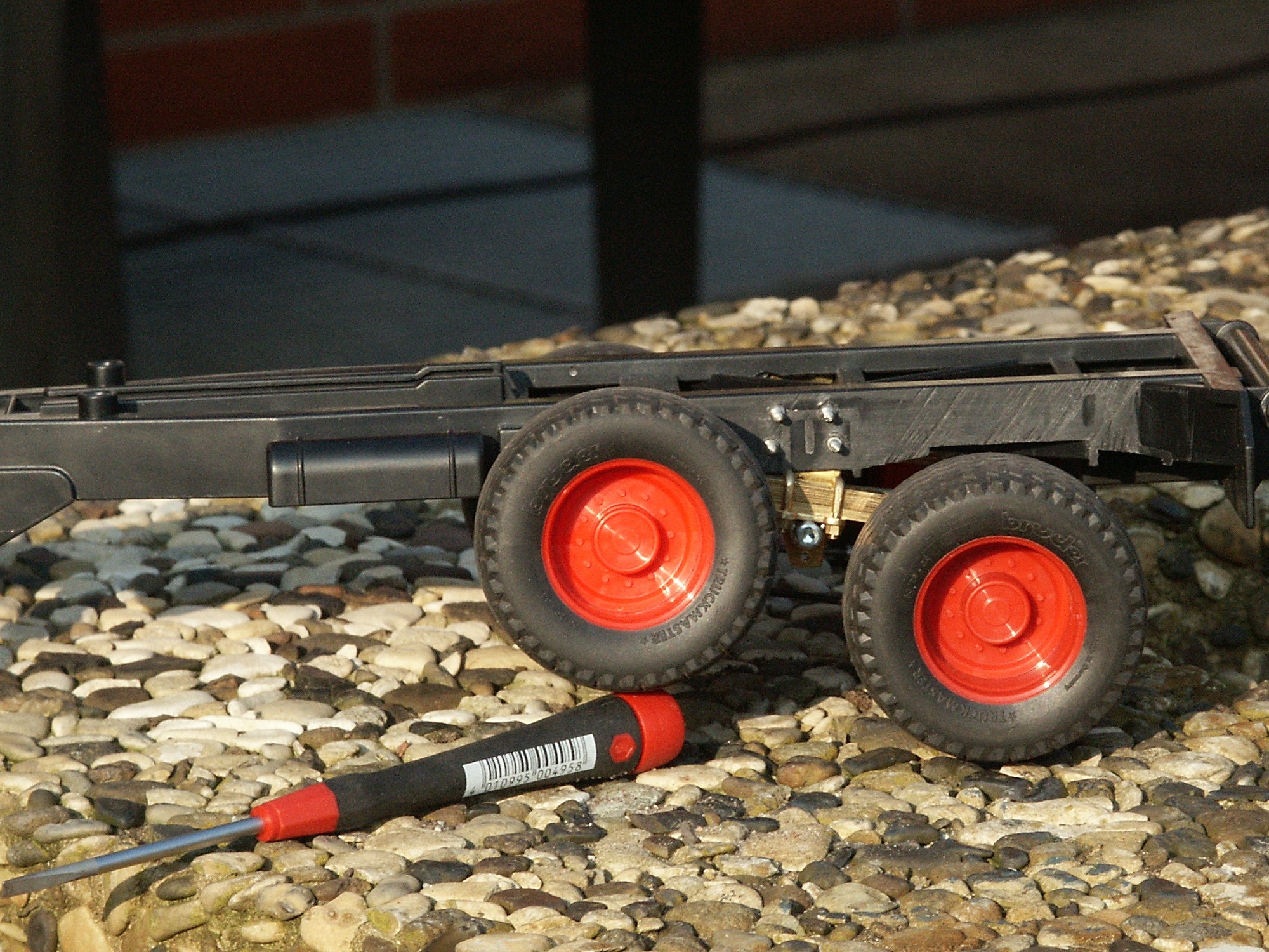 Die Räder des Anhängers gefielen mir eigentlich ganz gut. Also suchte ich nach einer Möglichkeit die neue Achse mit den alten Rädern zu bauen. Da fiel mir ein Tamiya Bauplan für einen Auflieger in die Hand. Die Lagerung der Achsen