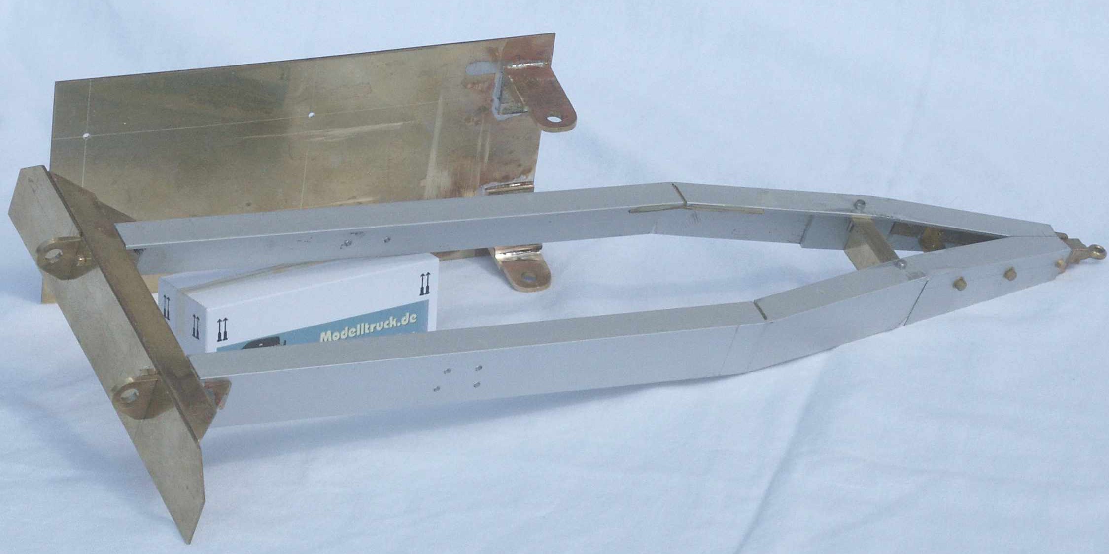 Baubeschreibungen in den Modelltruckzeitschriften hatte ich schon ausgiebig gelesen. Nun wollte ich sehen, ob ich es auch in die Praxis umsetzen konnte.Dazu musste erst einmal ein neuer Rahmen gebaut werden. Der Rahmen entstand nach den Abmessungen des Bruder-Rahmens aus Alu-Winkelprofil 20 x 10 x 1,5 mm. Um Platz für die Kippeinrichtung zu