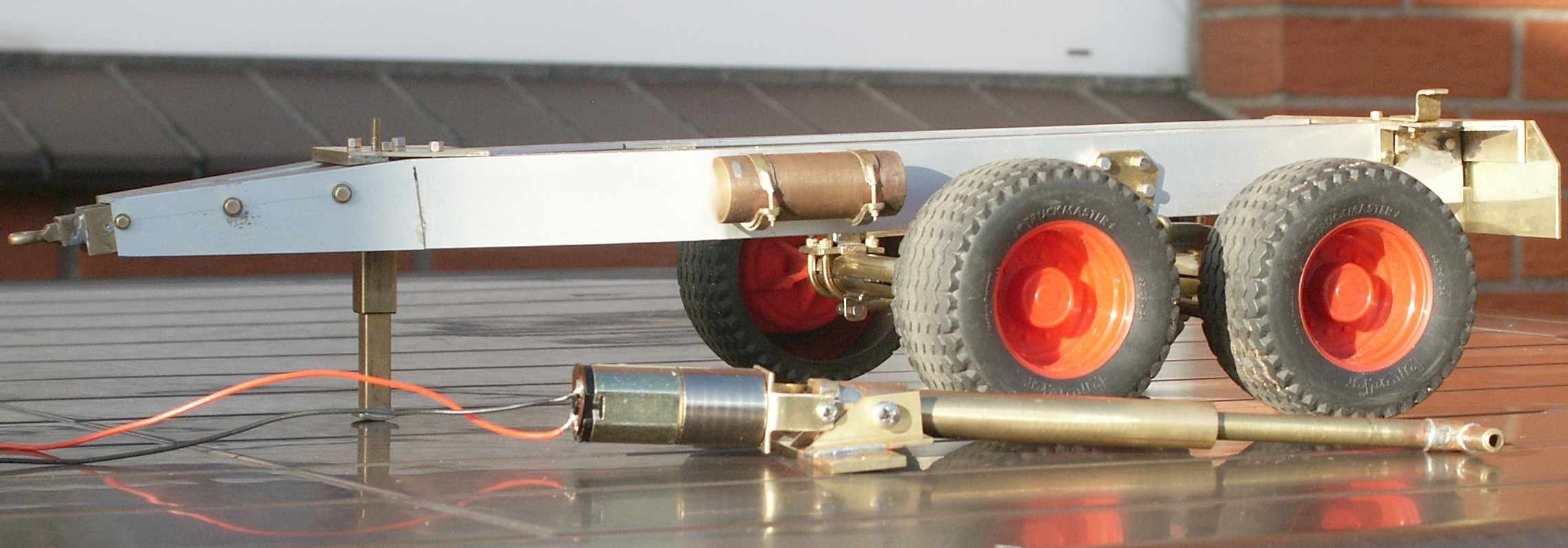 werden nun wiederum Messingröhrchen mit 4 x 0,5 mm Durchmesser gesteckt. Auf diesen Röhrchen pendelt der Lagerbock, deshalb müssen sie etwas länger sein als die Röhrchen im Lagerbock. Die Lagerböcke habe ich mit 3 mm Inbusschrauben an den Achsträgern befestigt. Nun mussten nur noch ein paar Längslenker angefertigt werden, hier kamen wieder Messingröhrchen zum Einsatz und fertig war die Pendelachse. Jetzt hatte ich ein doch recht geländegängiges Gespann.Der Rahmen