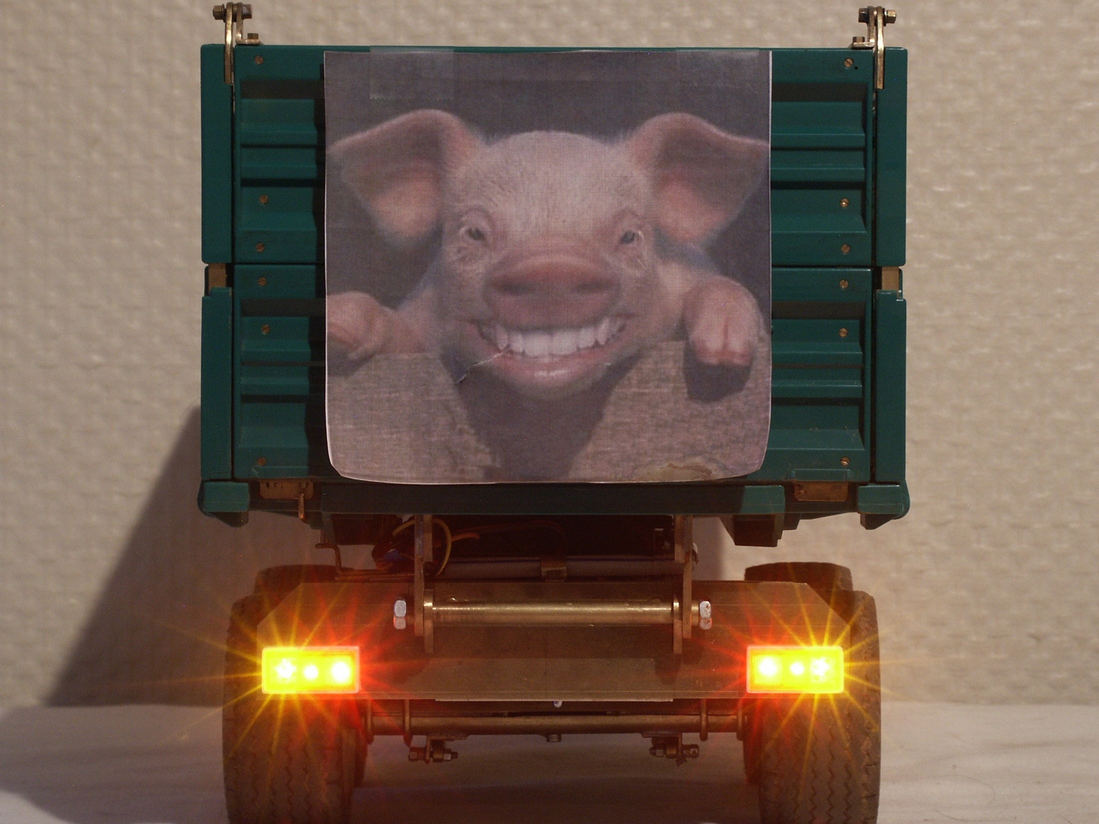 Der Anhänger von Dickie fing langsam an zu quietschen, außerdem sah er, im Vergleich zum Fendt doch ziemlich klein aus. Da fiel mir der grüne Tandemachsanhänger von Bruder in die Hände. Durch die höheren Bordwände sieht der Anhänger etwas größer aus und passt relativ gut zu dem Fendt.