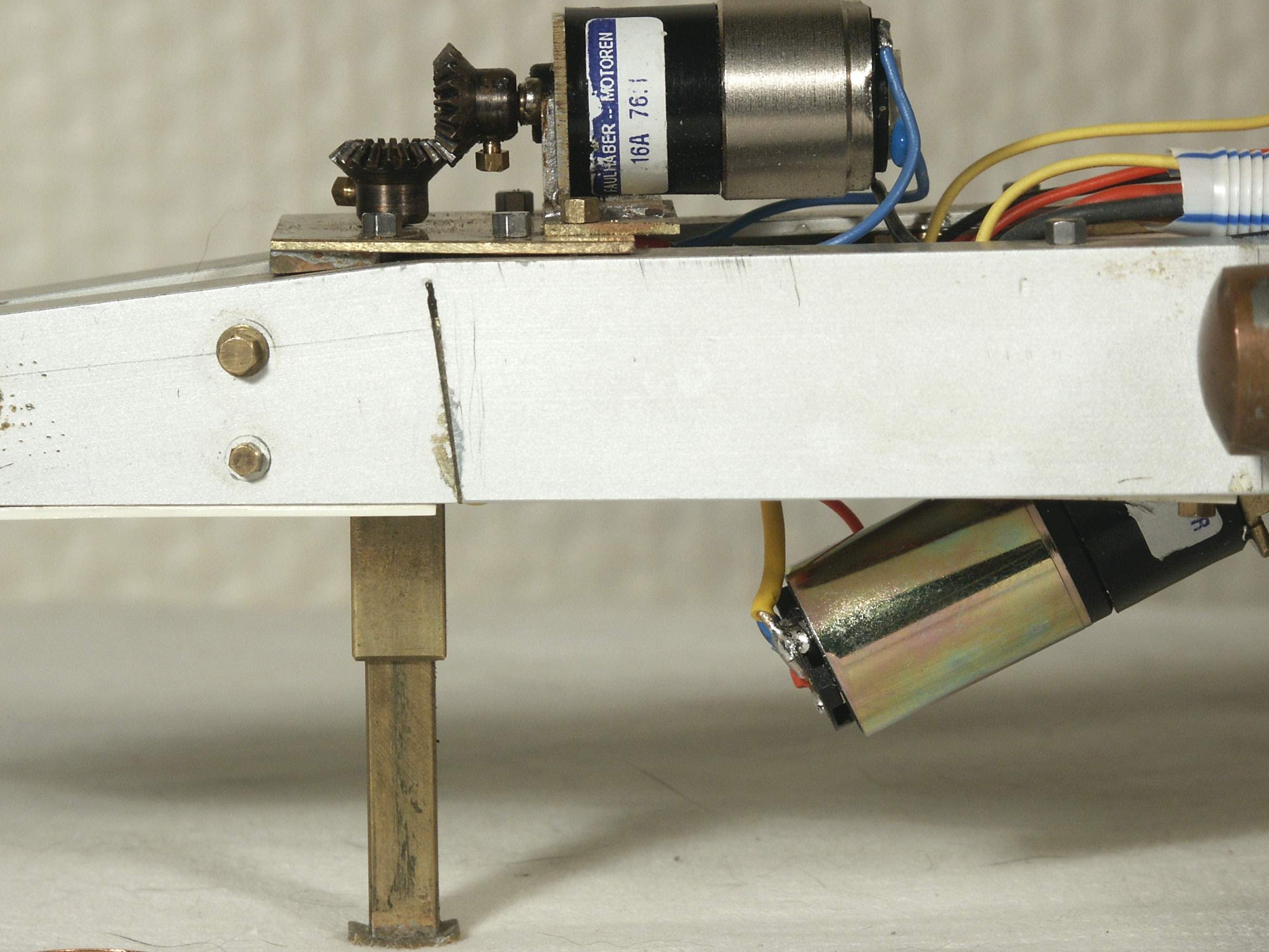 behalten, habe ich nur zwei Traversen eingebaut. Eine Traverse sitzt ganz hinten im Rahmen und trägt gleichzeitig die Stoßstange und das rahmenseitige Kipplager. Die zweite sitzt im vorderen Bereich, dort wo die Rahmenwangen nach unten abknicken. Die Zugvorrichtung brauchte ich nur aus dem alten Rahmen in den Neuen umzusetzen. Die Kippbrücke wollte ich von Bruder übernehmen aber der Boden sollte verstärkt werden. Die Messingplatte auf dem linken Bild wird unter den Kipperaufbau geschraubt. An der Platte sind die Kipplager des Aufbaus angelötet, auch die Anlenkung der Kippeinrichtung soll daran befestigt werden.Die Kippspindel