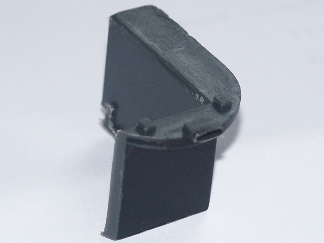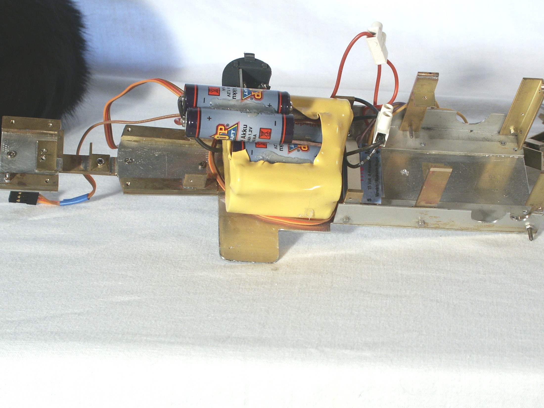 Ein Plastikformteil muss von der Originalplatte noch abgeschnitten werden (siehe Bild), dieses Teil wird mit einem Winkel auf der neuen Bodenplatte befestigt. Später werden hier der Ein‑ und Ausschalter und die Ladebuchse eingebaut.Der weitere Umbau