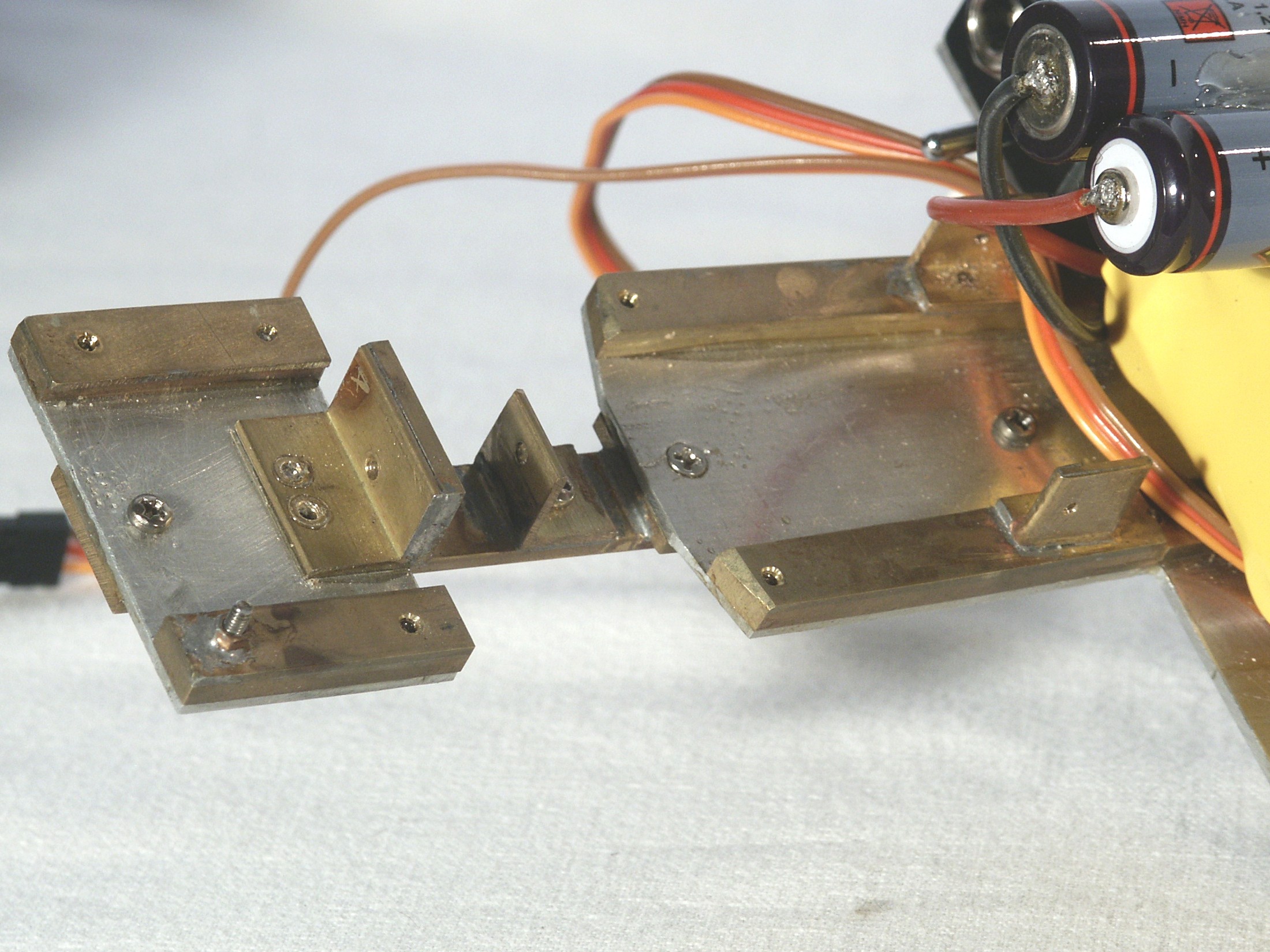 jetzt zweiteiligen Bodenplatte exakt die gleichen Abmessungen wie vor dem Trennen. Damit zum Pendeln der Achse auch in der Höhe genügend Platz vorhanden ist, habe ich die Messingstange noch mit 2 mm starkem Messingblech unterfüttert. Jetzt wurden noch zwei Winkel als Aufnahme für die Achse angebracht. In die Winkel kommen die Bohrungen für den Lagebolzen der Pendelachse. Anschließend wurden alle Anbauteile verlötet bzw. mit Uhu-Endfest verklebt und 5 Minuten bei 180°C im Backofen gebacken.