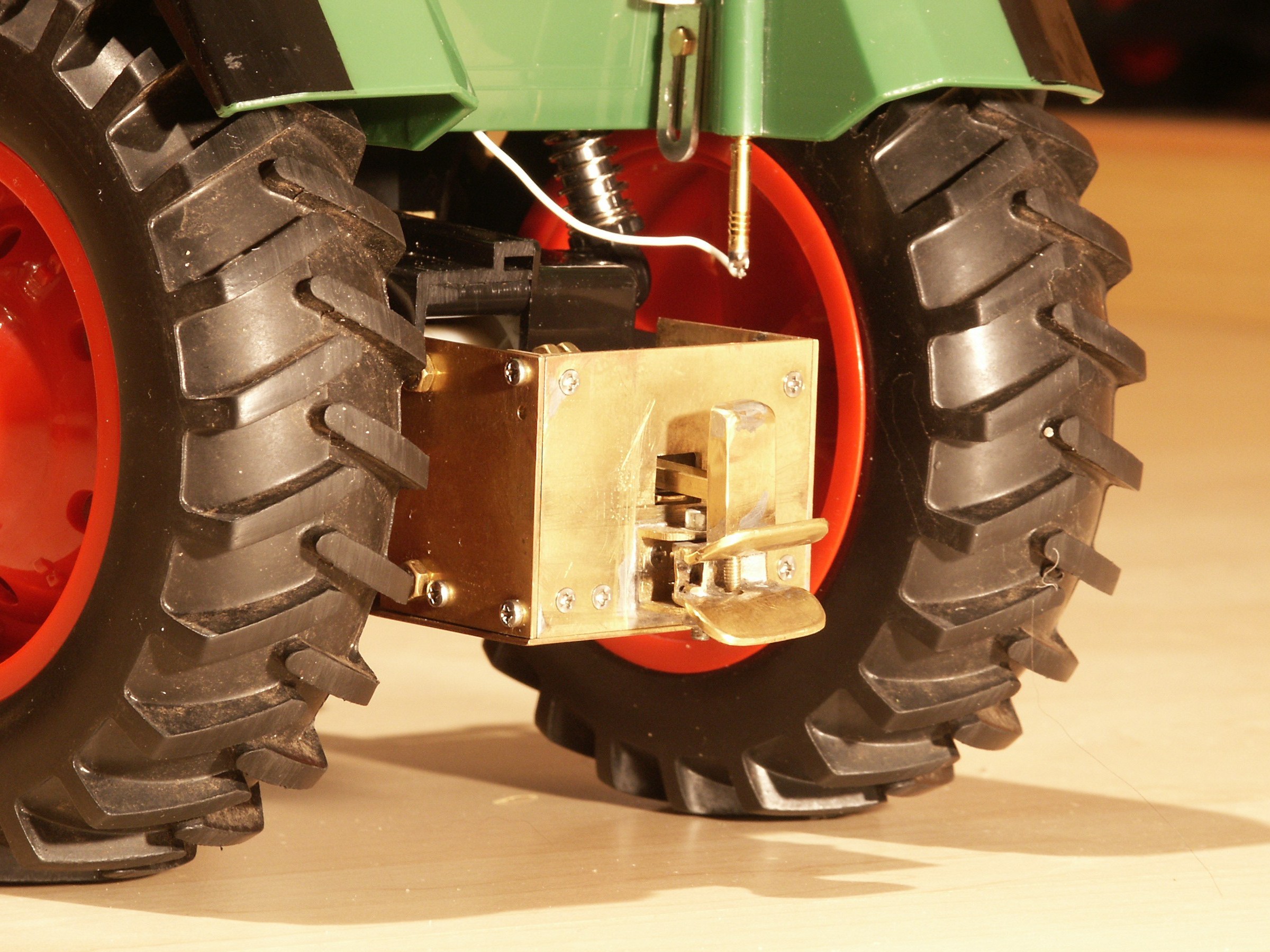 Messing gebaut, Kupplung hinten angeschraubt und das komplette Teil am Getriebegehäuse befestigt. In diesem Kasten ist der Servo für die Betätigung der Kupplung untergebracht. Auf der Homepage von Götz Birkner habe ich inzwischen eine elegantere Lösung gesehen. Nun ließ sich der Anhänger soweit einschlagen, dass die Deichsel die Hinterräder des Trekkers berührt. Weiter geht es nicht. Zufrieden?