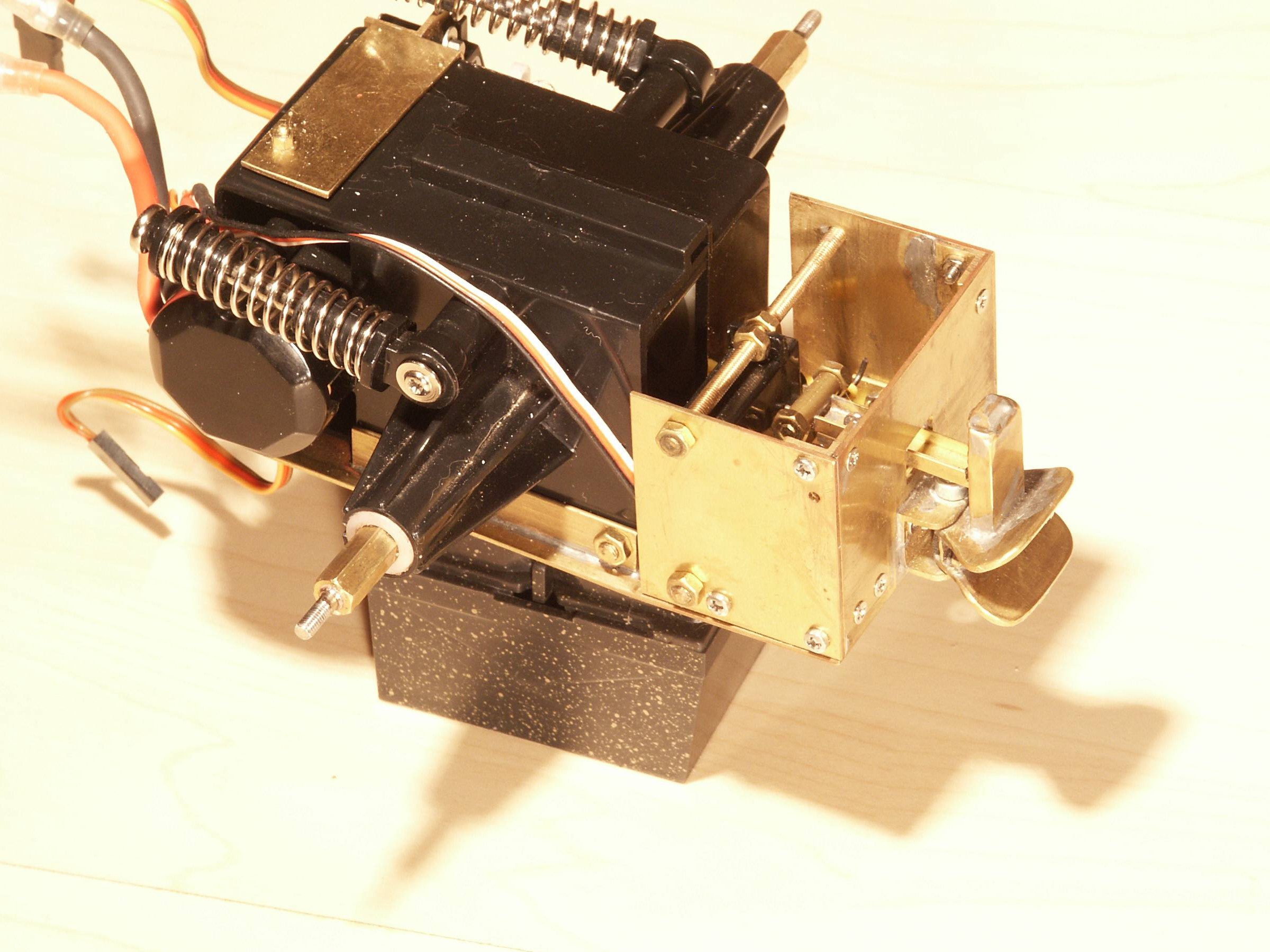 Messing gebaut, Kupplung hinten angeschraubt und das komplette Teil am Getriebegehäuse befestigt. In diesem Kasten ist der Servo für die Betätigung der Kupplung untergebracht. Auf der Homepage von Götz Birkner habe ich inzwischen eine elegantere Lösung gesehen.