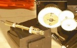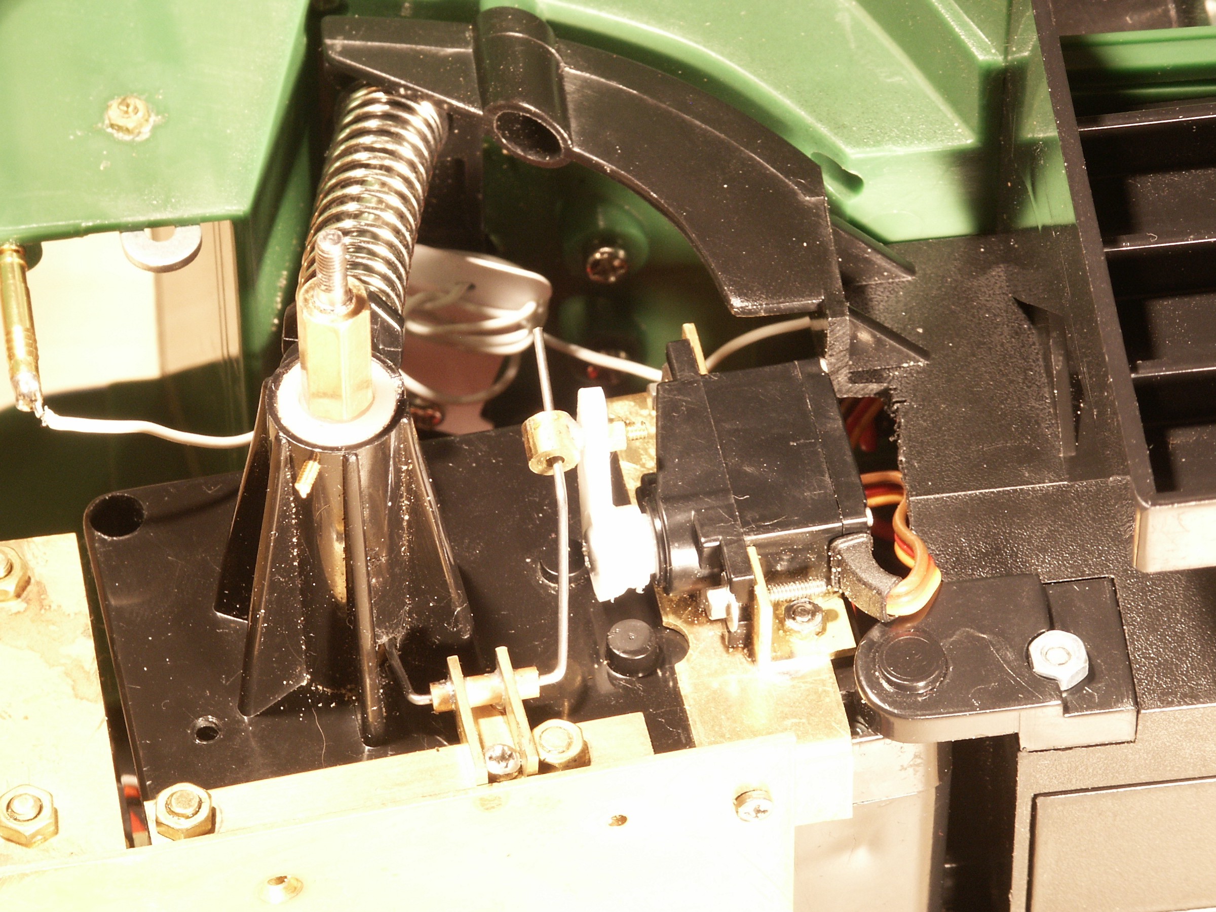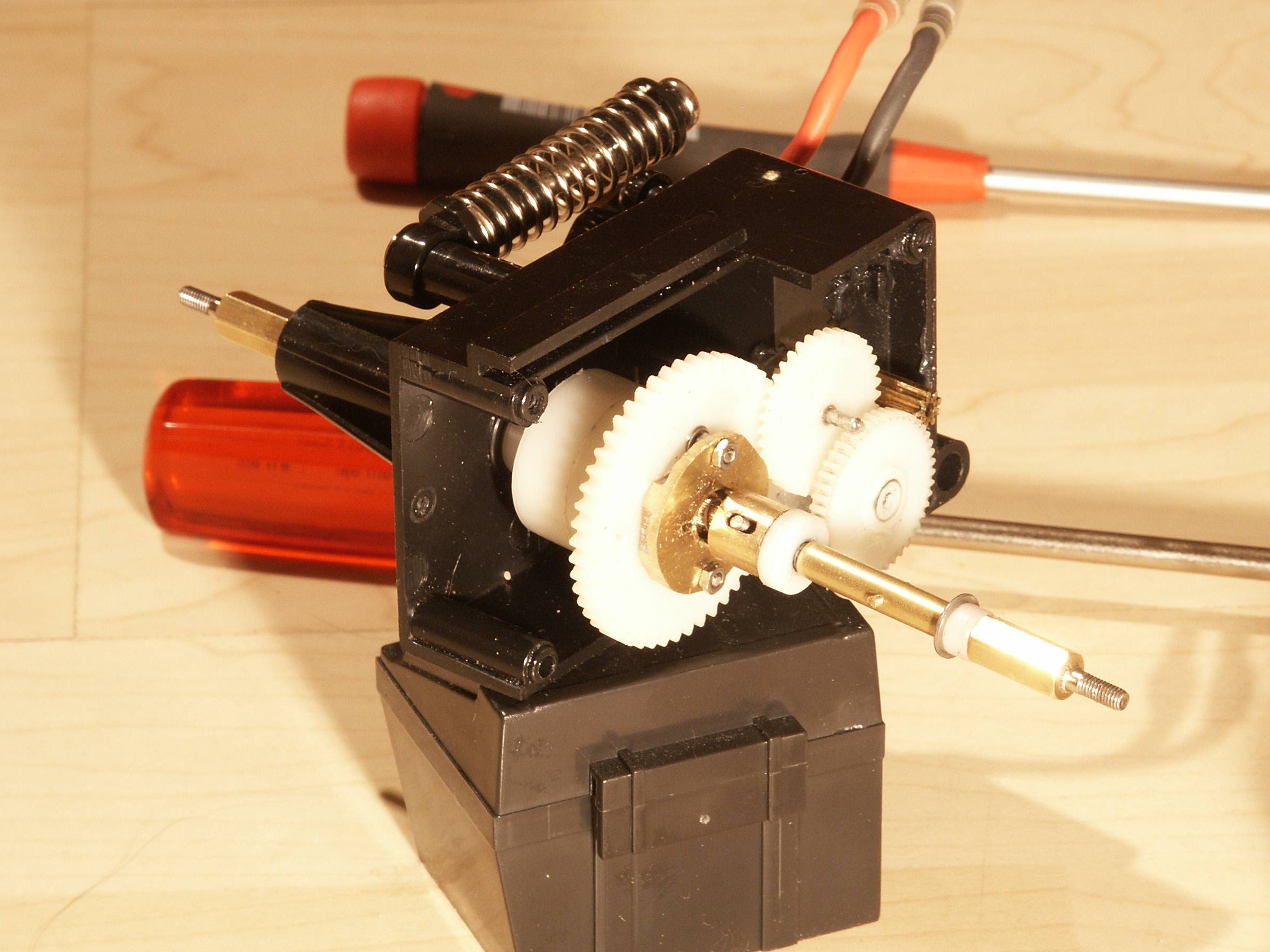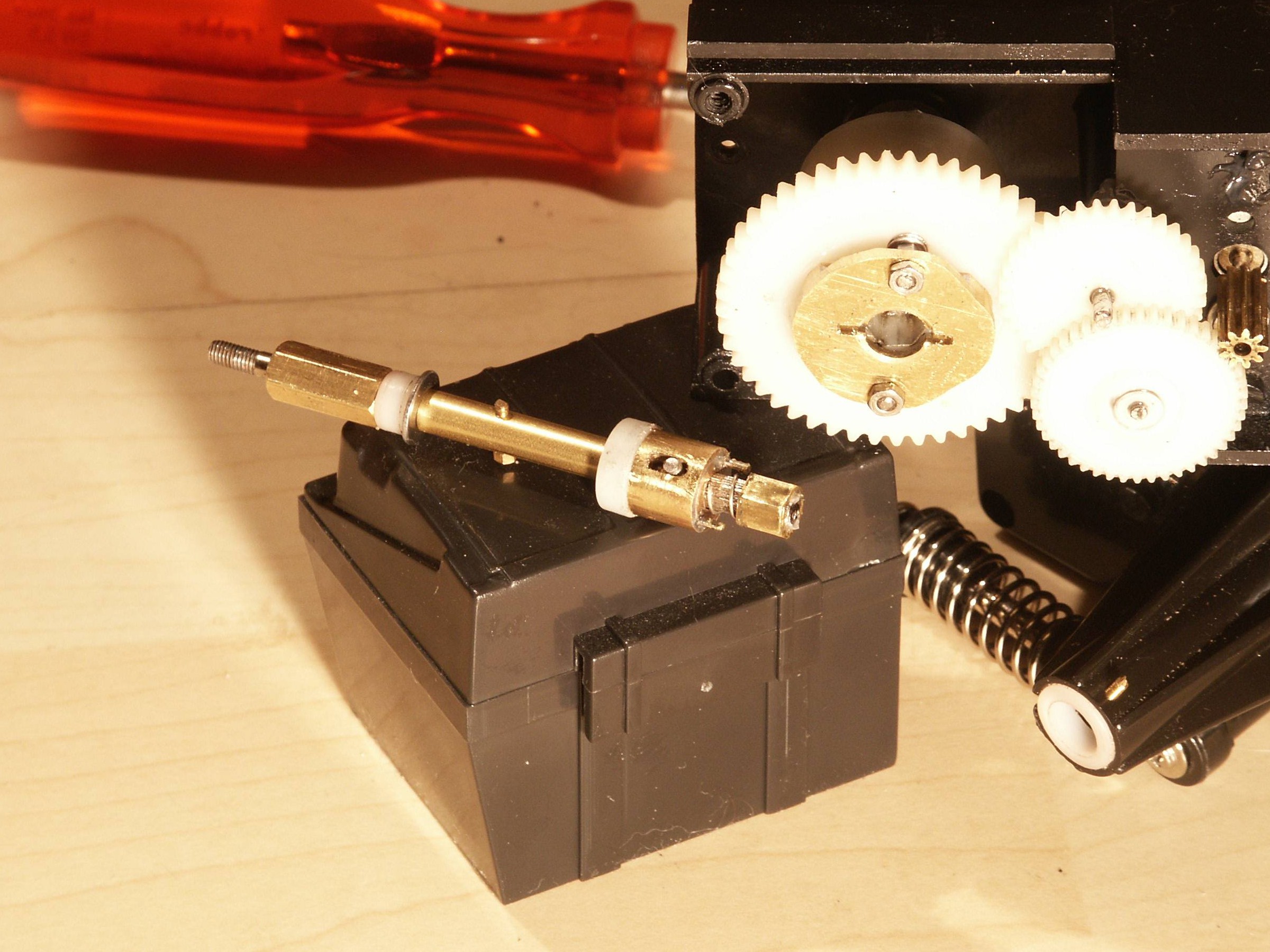 eingefeilt. In diese Schlitze greifen bei gesperrter Achse die Stifte der Schiebemuffe. Die Muffe wird mit einem außen am Getriebegehäuse angebrachten Servo betätigt. Die Kraftübertragung erfolgt durch einen zurechtgebogenen 1 mm Federstahldraht.
