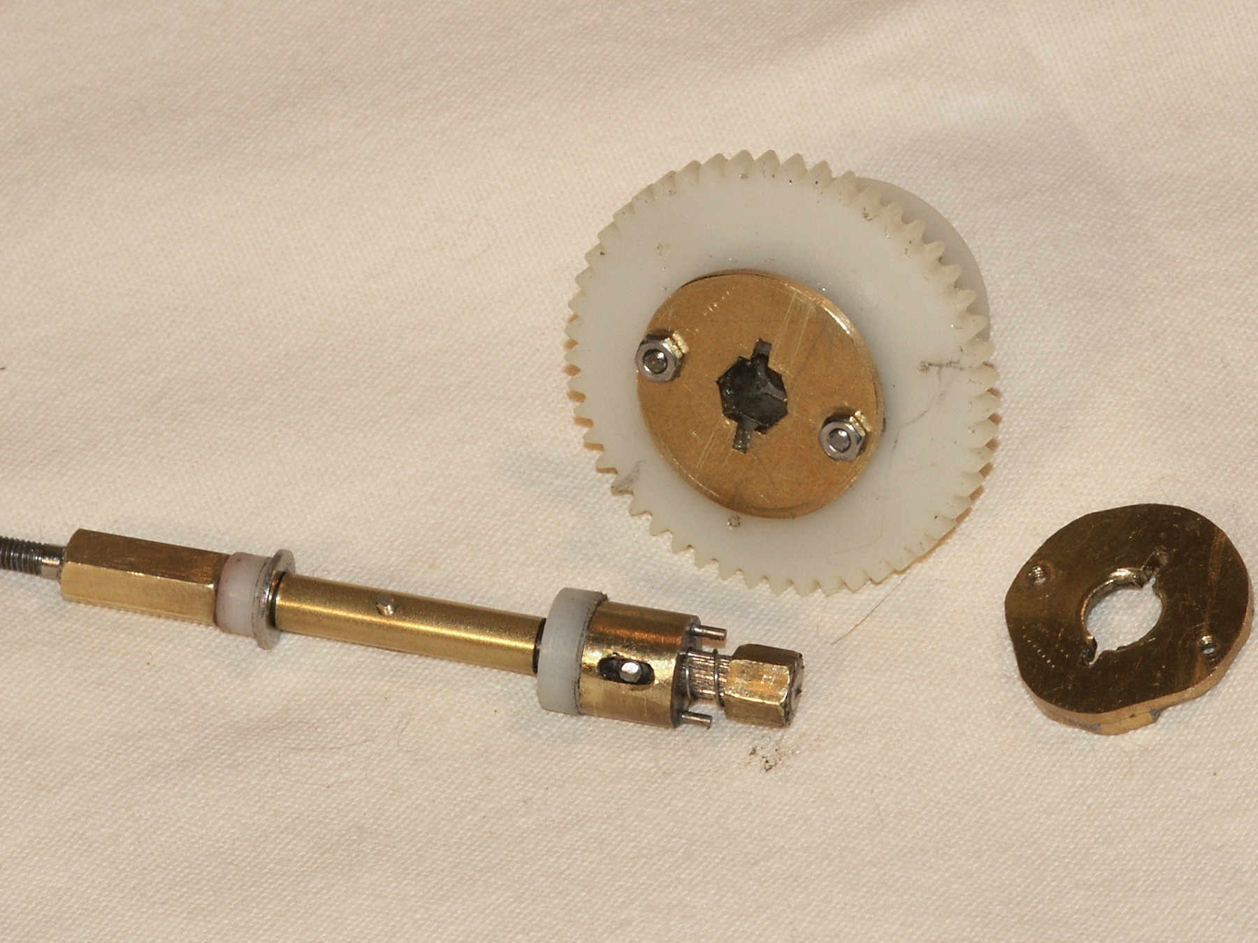 Nachdem in der letzten Zeit, speziell seit der Euromodell Bremen, die Sperre immer länger brauchte um einzurasten, kam der Gedanke auf, dass wohl auch ein Modell ab und zu einen Werkstattaufenthalt über sich ergehen lassen muss. Der Tausch des Motors war eine optimale Gelegenheit dazu. Nachdem das Getriebe zerlegt war, konnte man sofort erkennen, wo die Gründe für die Störungen zu suchen waren. Die Schiebemuffe und die eingelöteten Federstahlstifte sahen noch ziemlich jungfräulich aus. Aber die Messingplatte mit den eingefeilten Nuten, die musste ausgetauscht