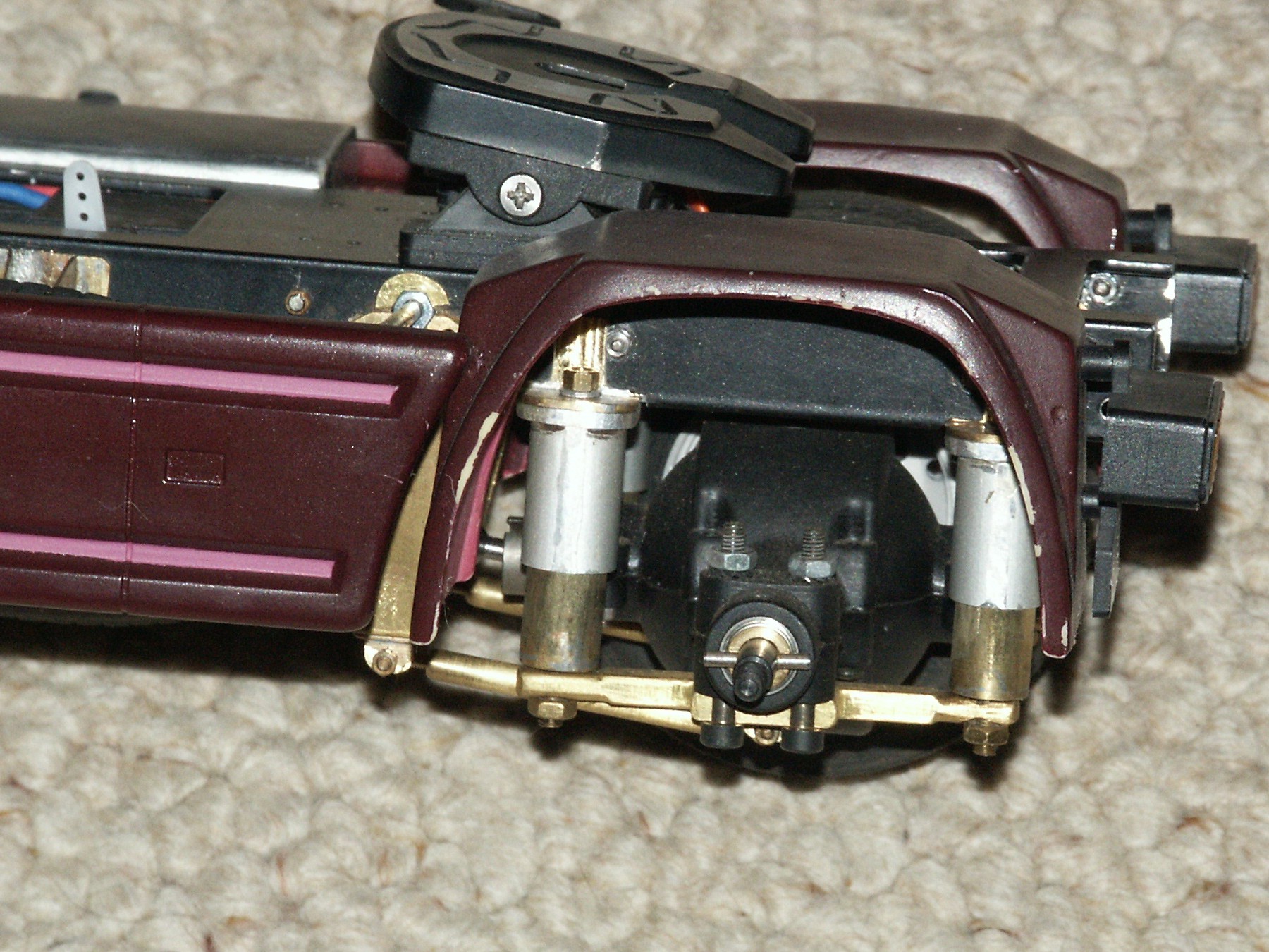 Ich habe dann längere Zeit überlegt, wie das Problem gelöst werden könnte. Eine zusätzliche Federlage kam nicht in Frage, dann würde er unbeladen bei kleinen Unebenheiten ein Rad in die Luft hängen. Dann kam der Katalog von Brand. Luftfederung, nur das Teil kostet ein Vermögen! Also, Luftfederung nachahmen. Aussehen und Anlenkung sind Brand bzw. dem Original nachempfunden. Zwei Rohre aus dem Material das ich gerade da hatte, das äußere Rohr aus Alu mit 12 mm Durchmesser und das Innere aus Messing mit 10 Durchmesser, bilden das Gehäuse der Federung. Im Inneren befindet sich eine Spiralfeder die von einer 3 mm Messing Rundstange geführt wird. Die Messingstange ist mit dem unteren Gehäuseteil fest verbunden. Am oberen Gehäuseteil tritt sie beim Einfedern nach oben aus und ist mit einer Mutter gegen herausfallen nach unten gesichert. Die