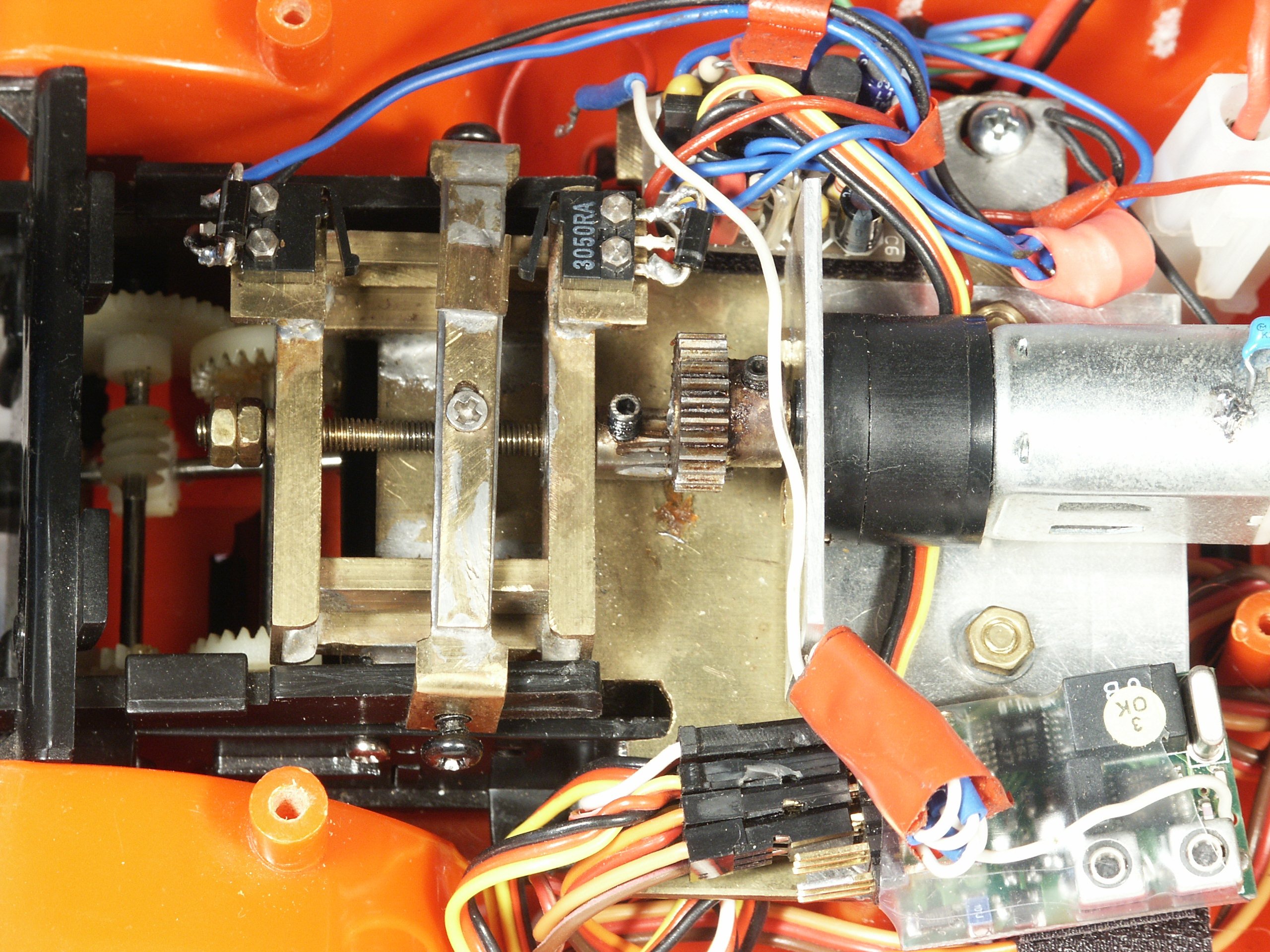 Der Mast des Staplers war nicht beweglich ausgeführt, das sollte auch geändert werden. Als Antrieb für den Mast wollte ich meinen ersten Spindelantrieb bauen, weil ich so die gesamten Bewegungsabläufe des Staplers mit den Kreuzknüppeln steuern konnte. Außerdem verbraucht dieser Antrieb nur Strom, wenn der Mast bewegt wird. Also noch einen Fahrtsteller, die mir bekannten Umpolschalter waren zu groß.