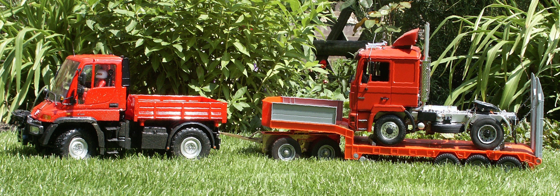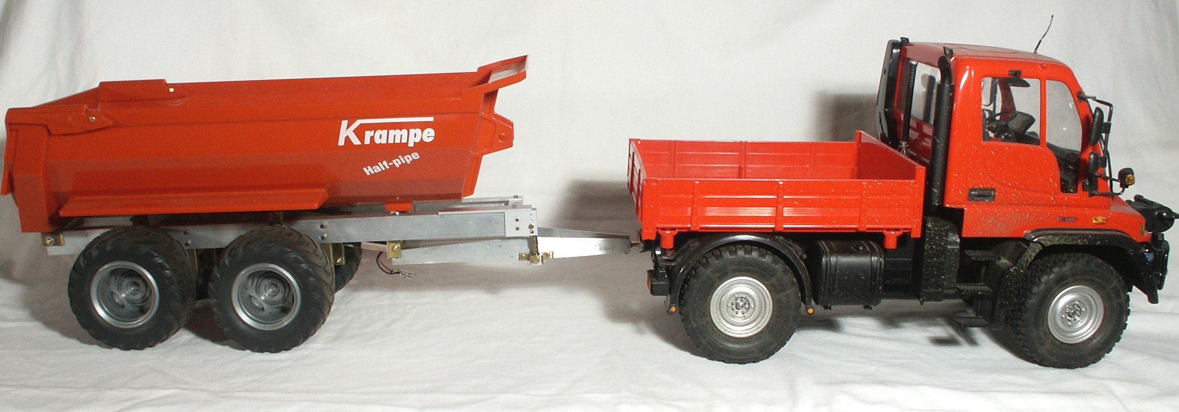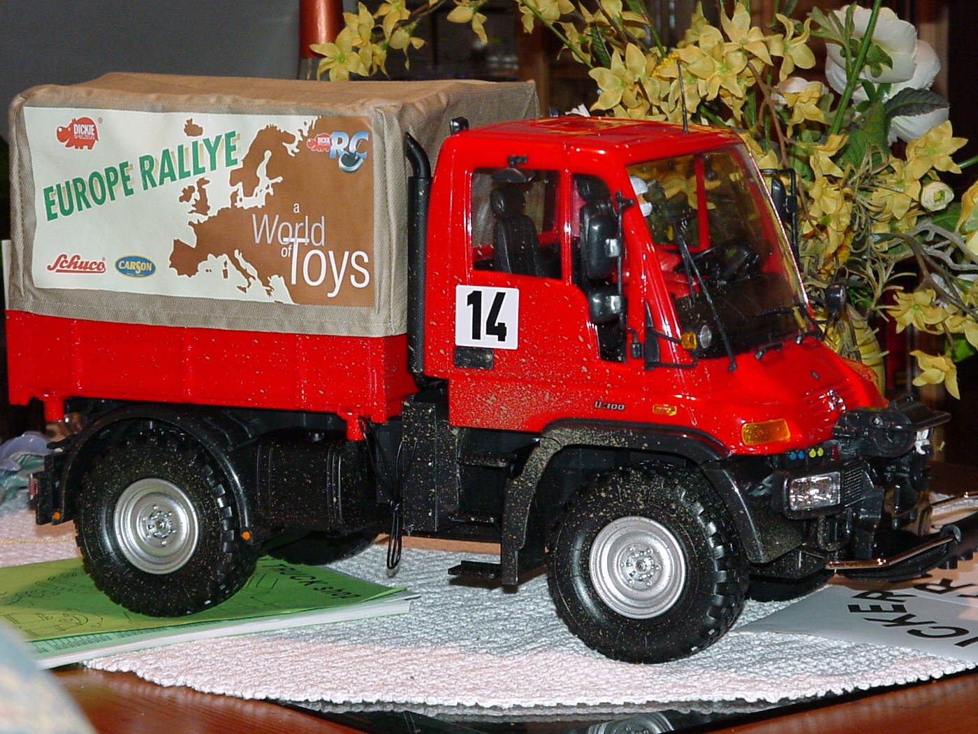 Im Dezember 2001 wurde der Unimog, als rote Rallye Version, bei uns in einem Supermarkt zu einem interessanten Preis angeboten. Ich hab ihn mir angeschaut und überlegt, kauf ich ihn oder kauf ich ihn nicht. Petra meinte, kauf ihn doch sonst ärgerst du dich, wenn er dann nicht mehr im Angebot ist. Aber ich war unentschlossen. Also ohne Unimog nach Hause. Doch er ging mir nicht aus dem Sinn, sah ja auch verdammt gut aus. Nach einiger Zeit intensiver Grübelei reifte der Entschluss, erstmal zu Oswald fahren. Oswald ist ein Freund aus der IG Heidetrucker und hat einen Dickie Unimog,