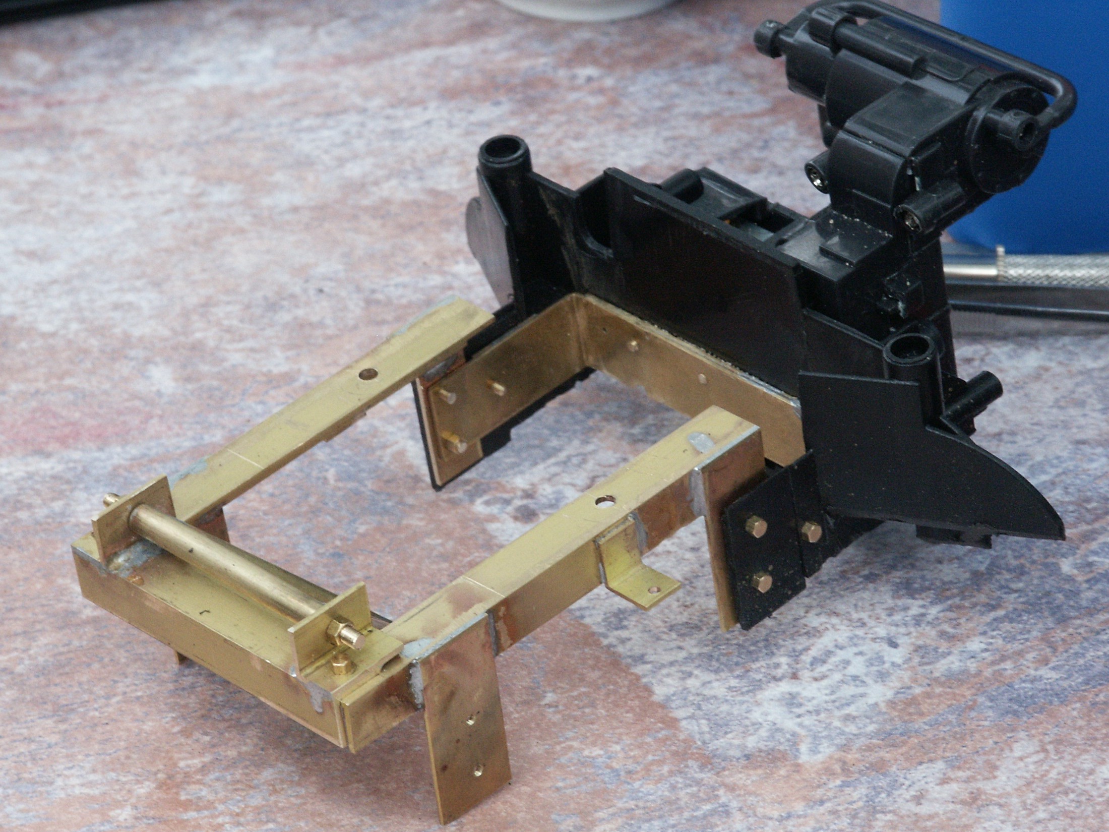 wollte, musste ich mir bei der Vorderachse etwas einfallen lassen.Um eine leichte Verschränkung der Achsen zu erreichen, sollte die Vorderachse pendelnd gelagert werden. Dafür habe ich in der unteren Rahmenschale einen "Hilfsrahmen“ im Bereich der originalen Achslagerung eingebaut und danach den nicht mehr benötigten Teil des Rahmens herausgetrennt. Die äußeren Laschen am Hilfsrahmen sind übrigens der Ersatz der entfallenen Befestigungspunkte für die obere Rahmenschale.