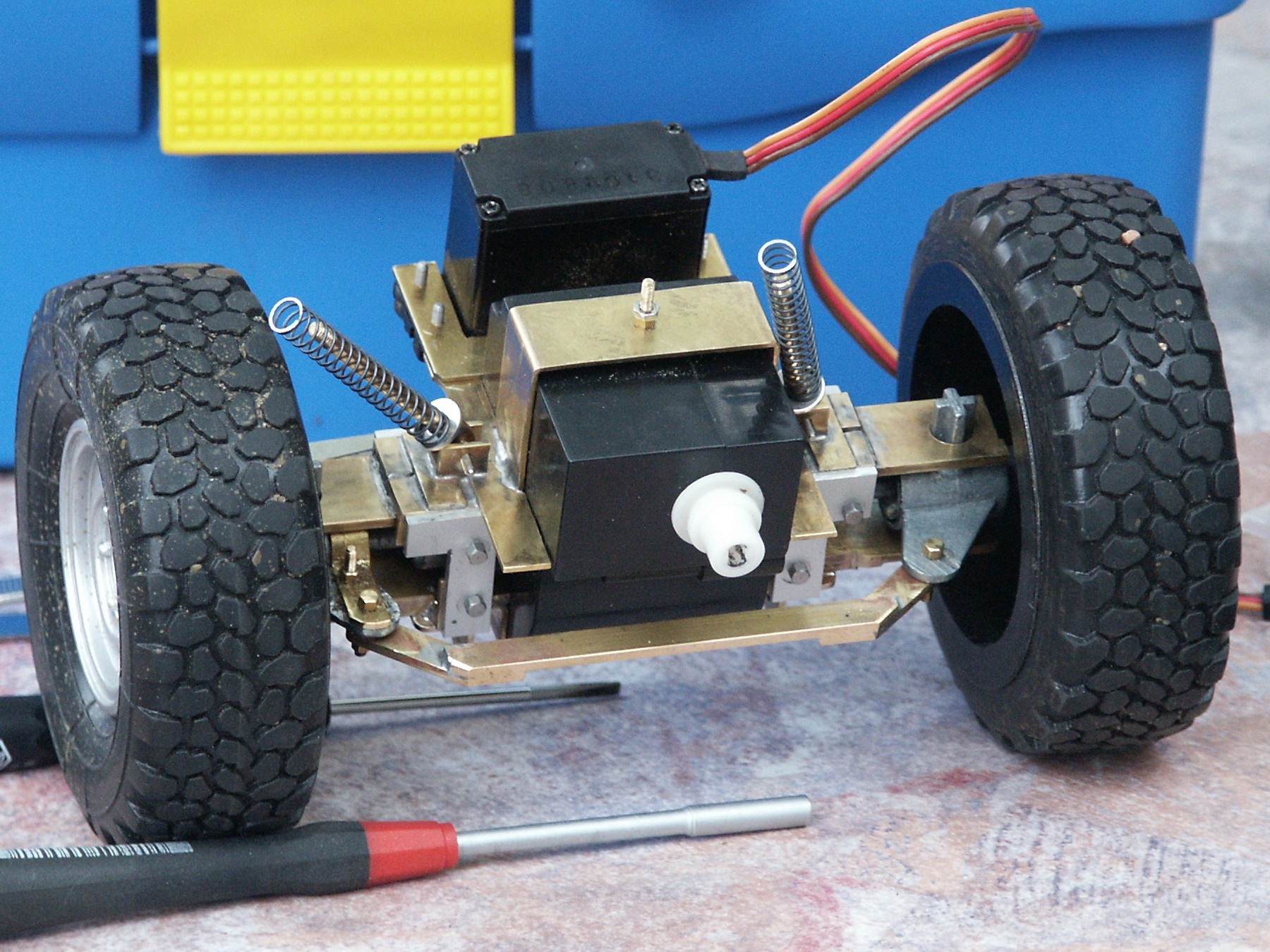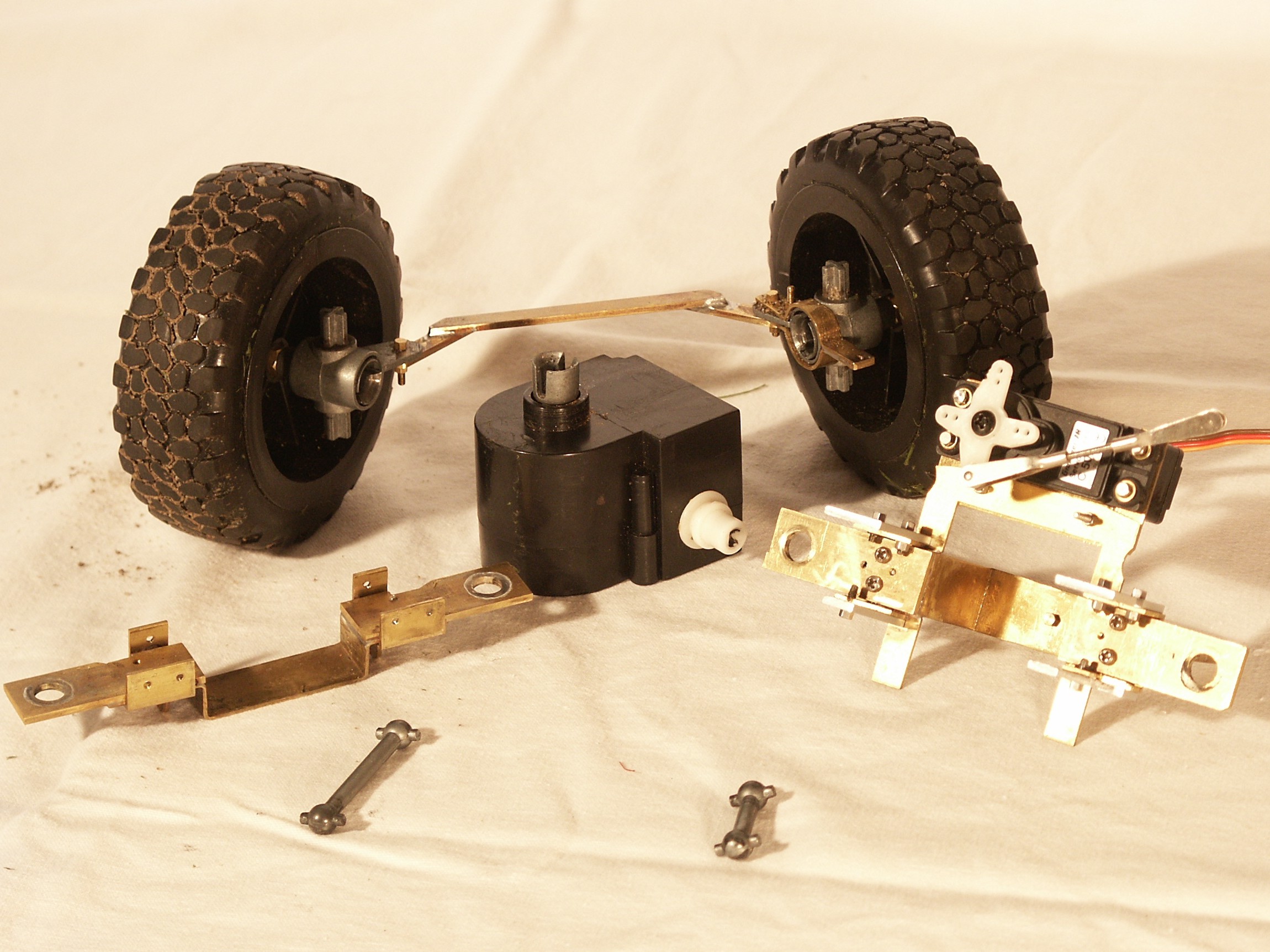 wurden nun mit dem Spurstangenhebel nach hinten in das Achsgehäuse eingesetzt. Die neue Spurstange aus Messing ist wesentlich zierlicher und so geformt, dass sie nicht mehr am Differenzialgehäuse anschlägt und dadurch ein größerer Lenkeinschlag möglich ist. Jetzt noch den Lenkservo, es ist ein Standardservo von Graupner, am Achsgehäuse befestigt und die Achse ist einbaufertig. Die so entstandene Vorderachse ist mit Federn am Hilfsrahmen aufgehängt und mit Längslenkern so geführt, dass sie nicht kippen kann.