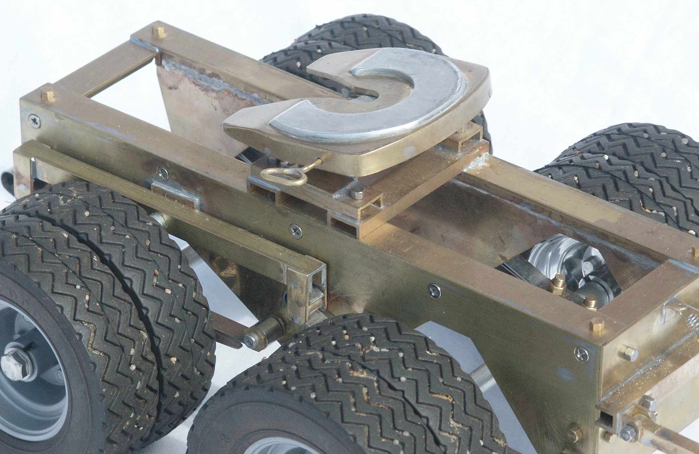 Eine Beleuchtung ist in den Unimog auch eingebaut worden. Als Lampen habe ich Leuchtdioden von Reichelt eingesetzt und zur Steuerung werden das Bremslichtmodul und die Blinklichtschaltung mit zusätzlicher Schaltmöglichkeit von Conrad verwendet. Damit kann ich jetzt nur Scheinwerfer und Abblendlicht gemeinsam einschalten, aber kommt Zeit kommt neuer Schalter.Damit der Unimog auch etwas zu ziehen hat, habe ich ihm einen Bruder Tieflader zur Seite oder besser ans Heck gestellt. Da der Unimog aber keine Sattelzugmaschine ist, habe ich für den Tieflader dann noch einen Dolly aus Messing gebaut.